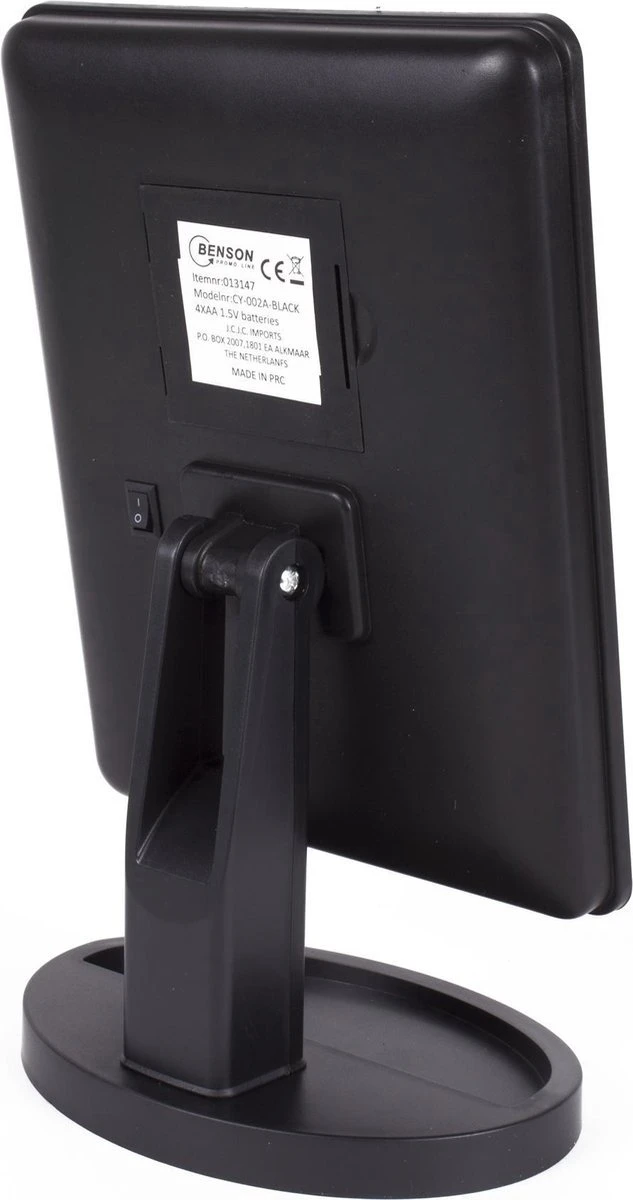 Mooie Make-up spiegel met afneembaar voetstuk. 16 LED lampjes verwerkt in de spiegel. Afmeting: 17x27x12cm. Kleur: Zwart